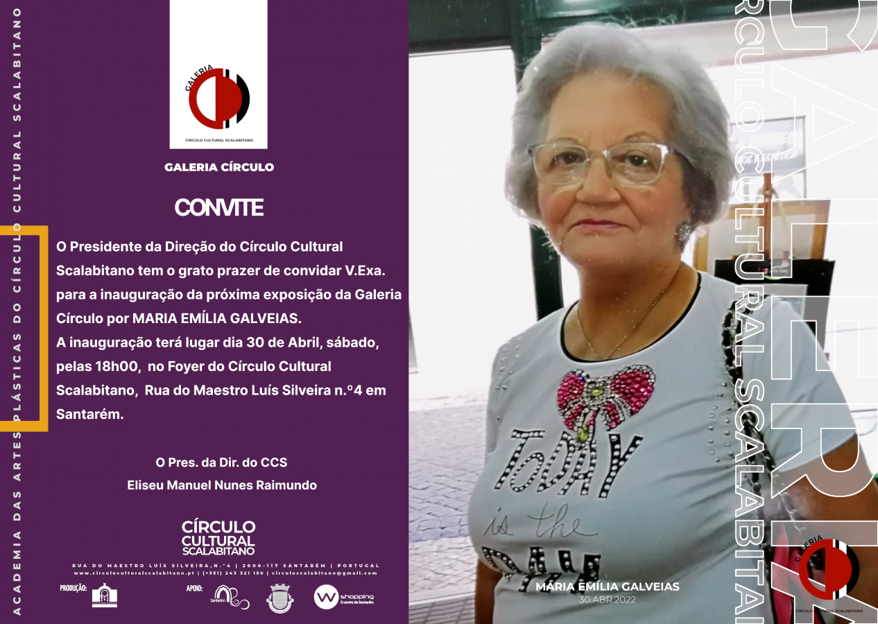 A Galeria Círculo, com curadoria de Fernanda Narciso, inaugura no próximo dia 30 de Abril pelas 18h00 no foyer do Círculo Cultural Scalabitano a exposição do artista Maria Emília Galveias, que encerrará a rubrica “As Pintoras da Cidade”, seguindo-se novo ciclo com a exposição de Ricardo Gonçalves. Estas exposições da Galeria Círculo inserem-se na Temporada da Primavera 2022 do Círculo.
