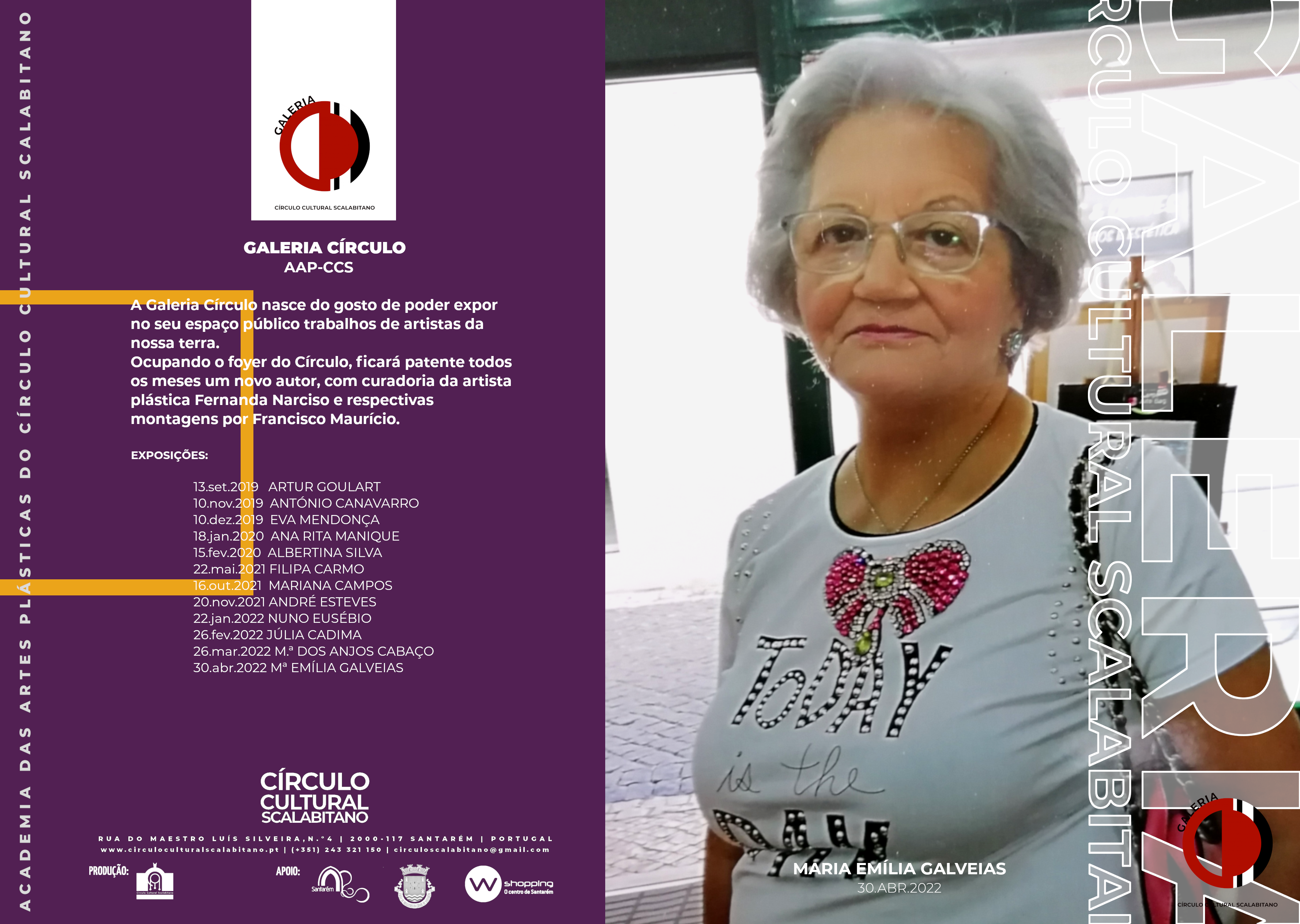 A Galeria Círculo, com curadoria de Fernanda Narciso, inaugura no próximo dia 30 de Abril pelas 18h00 no foyer do Círculo Cultural Scalabitano a exposição do artista Maria Emília Galveias, que encerrará a rubrica “As Pintoras da Cidade”, seguindo-se novo ciclo com a exposição de Ricardo Gonçalves. Estas exposições da Galeria Círculo inserem-se na Temporada da Primavera 2022 do Círculo.