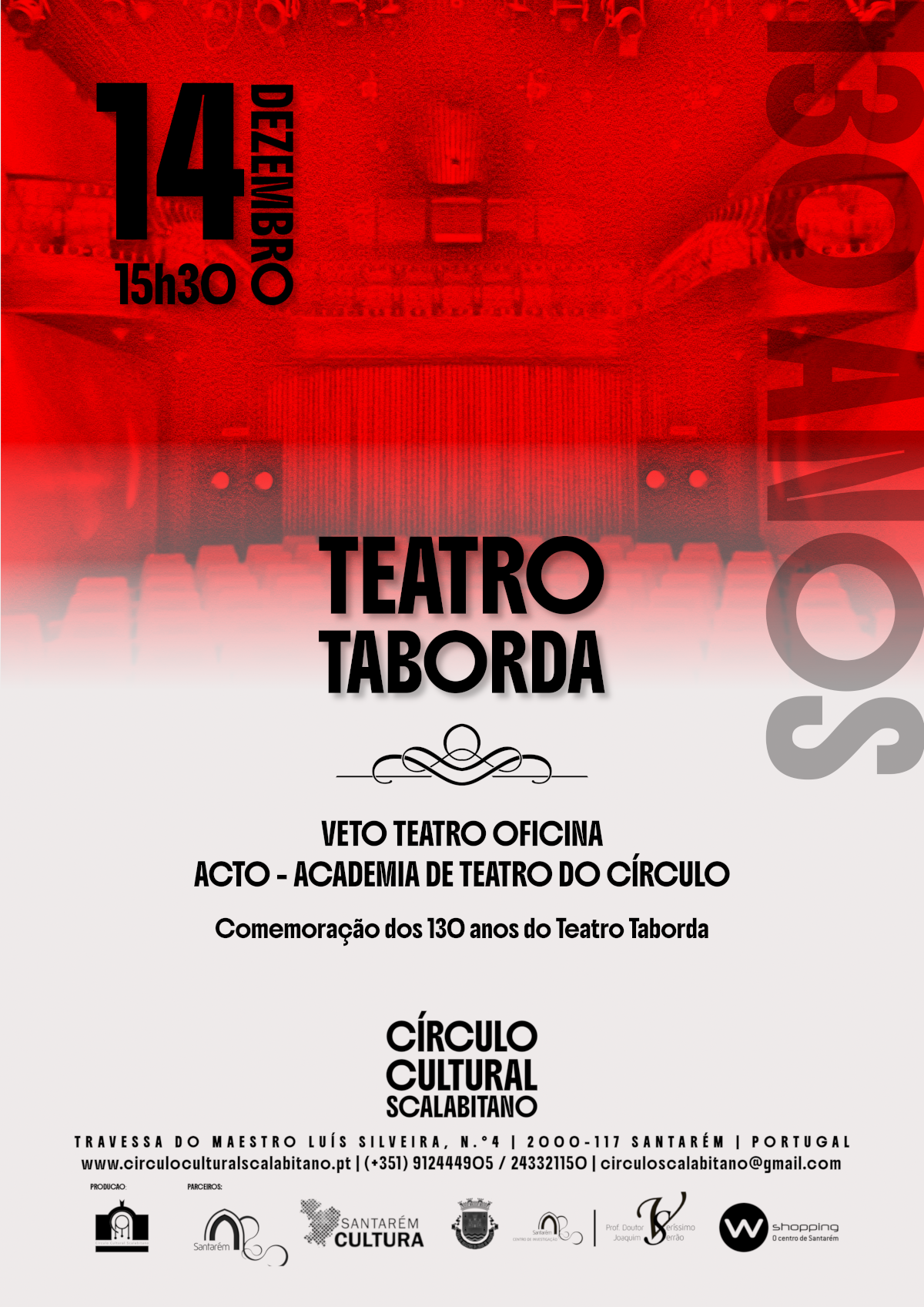 No próximo dia 14 de dezembro comemoramos os 130 anos do nosso Teatro Taborda em dois momentos específicos, o primeiro com o Veto Teatro Oficina, Jograis, e de seguida com a Academia de Teatro do Círculo – ACTO, sob a direção de Fernanda Narciso com o “Olha olha”.