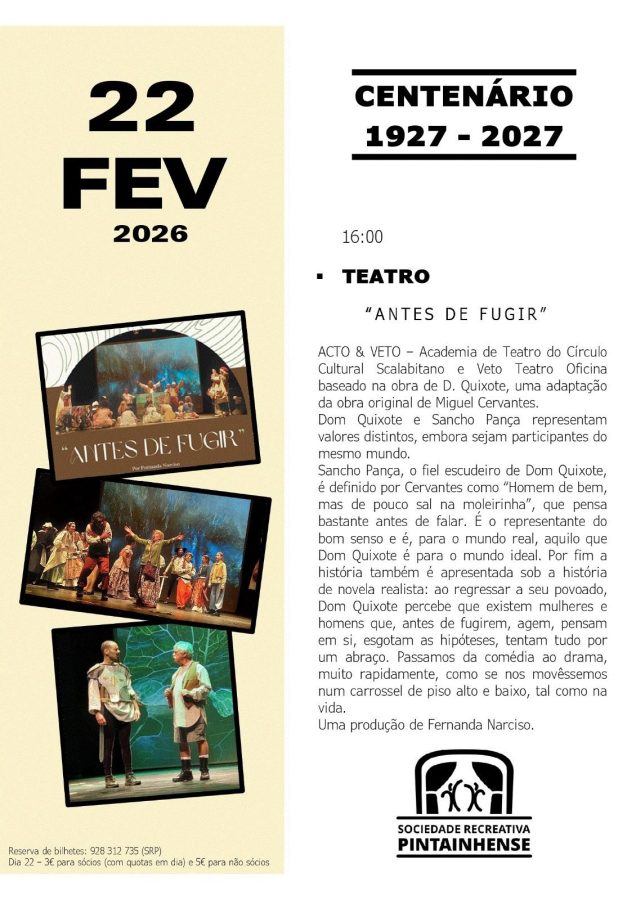 A ACTO – Academia de Teatro do Círculo e o Veto Teatro Oficina, deslocam-se a Torres Novas, mais precisamente a Pintainhos, com “Antes de Fugir” de Fernanda Narciso, a convite da Sociedade Recreativa Pintainhense, num espetáculo integrado nas comemorações do Centenário desta Sociedade Recreativa. Este trabalho de Fernanda Narciso teve a sua estreia na Gala do Círculo Cultural Scalabitano comemorativa dos seu 70.º aniversário a 18 de dezembro de 2024